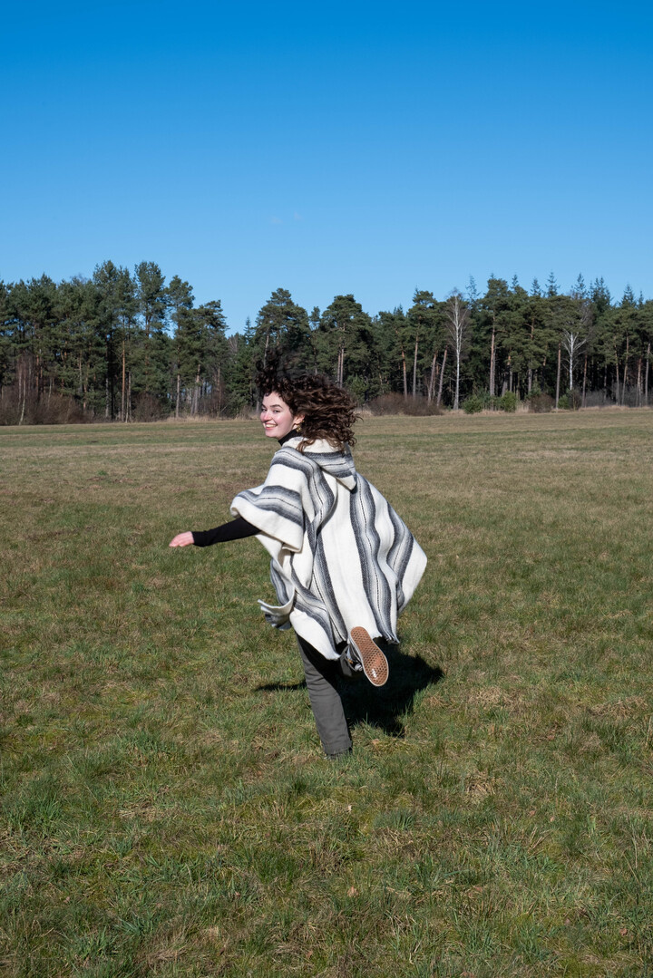 Wollprodukte müssen nicht unbedingt gewaschen werden, denn Wolle ist selbstreinigend und unangenehme Gerüche verschwinden, wenn man den Poncho nur lüftet. Sollten sich Flecken auf dem Poncho befinden, können Sie diese mit Seife und lauwarmem Wasser entfernen. Sanft tupfen oder reiben und dann gut ausspülen. ACHTUNG: Wenn Sie zu stark reiben, kann die Wolle verfilzen, und das wollen Sie nicht, also tupfen Sie vorsichtig.