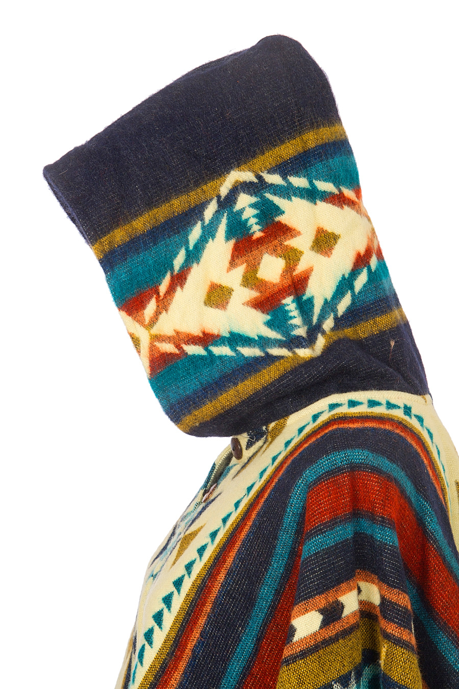 The poncho can be machine washed on a wool wash or hand wash cycle at 30 degrees or colder.
